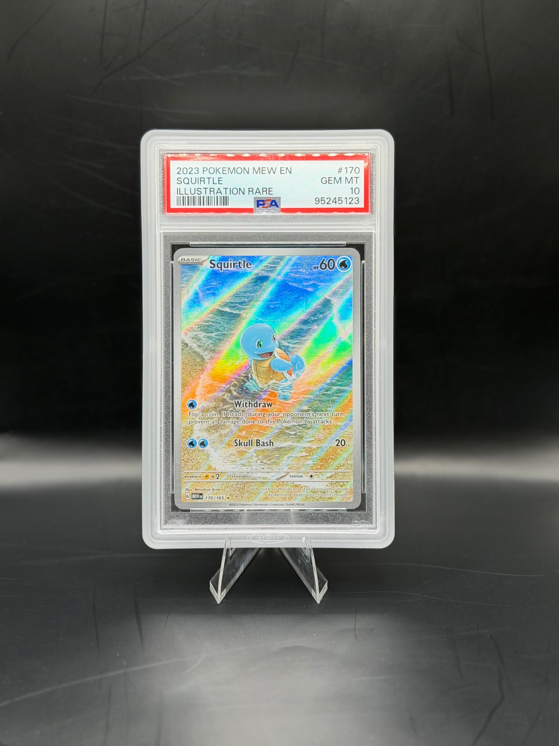 2023 Pokémon Squirtle #170 Illustration Rare, graded PSA 10 Gem Mint. This charming Water-type starter features gorgeous illustration artwork from the celebrated Pokémon 151 set. Awarded PSA's highest grade of 10—perfect centering, sharp corners throughout, flawless surface, and pristine edge quality. A premium collectible that belongs in every serious 151 collection. Ships in the original PSA case, securely packed with tracking and insurance.
